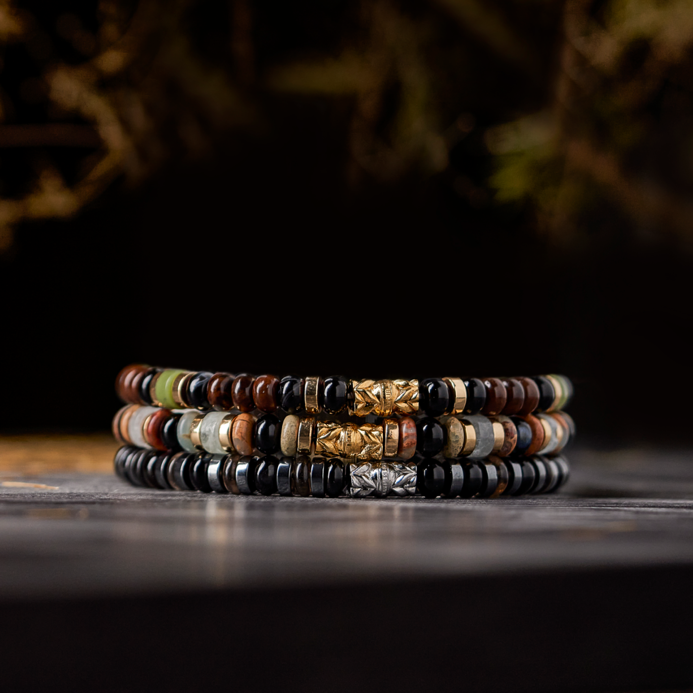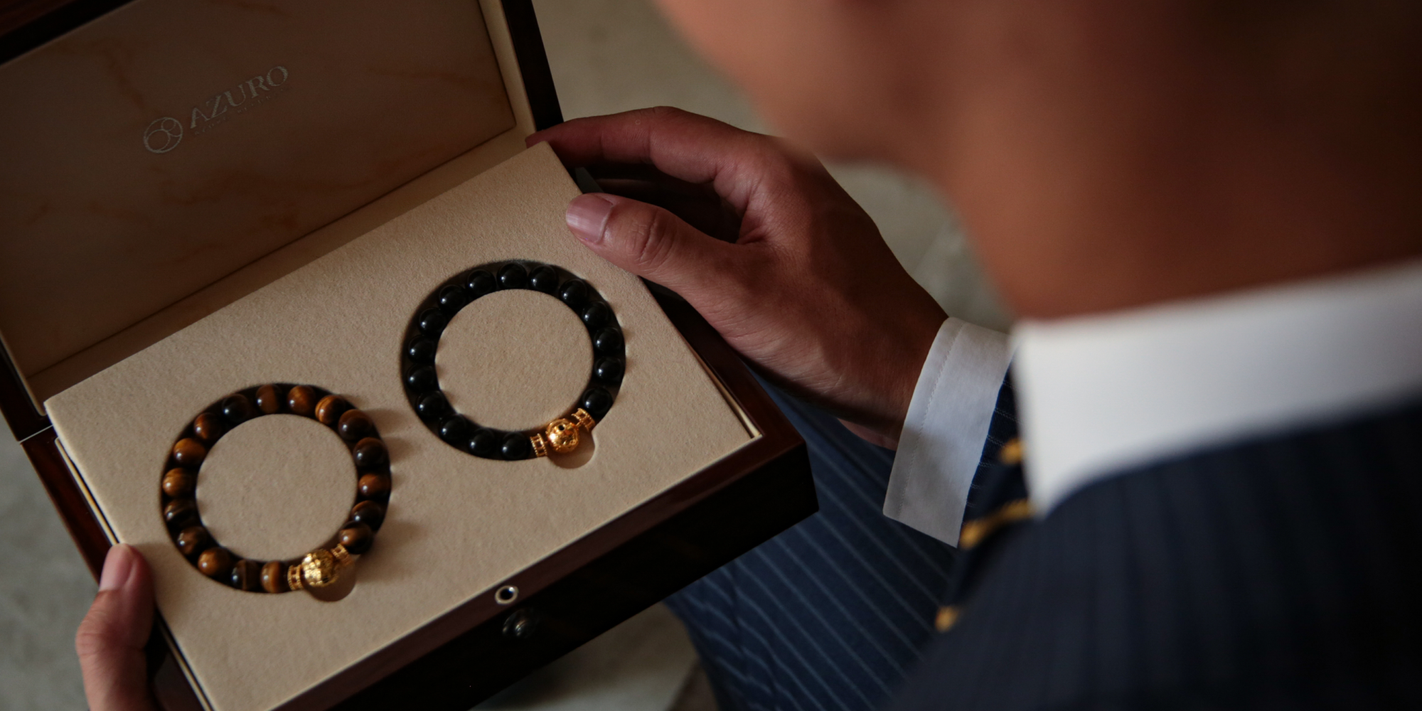 Create your unique bracelet with Azuro's customization tool. Choose from over 100 gemstones and materials like bead strings, elastic, or leather. Personalize bracelets with healing stones such as tiger eye, obsidian, lapis, and turquoise. Add gold and silver evil eye beads, buddha charms, or spiritual animal designs for extra flair. Start personalizing your custom bracelet today..
